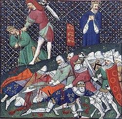 En 1346, deuxième attaque d’Edouard III, la bataille de Crécy. Encore une fois, selon les sources les troupes anglaises sont en infériorité numérique, mais les archers, très bien ordonnés et très bien coordonnés, éliminent avec grande efficacité les chevaliers français. Édouard III est en capacité de conquérir le trône de France.